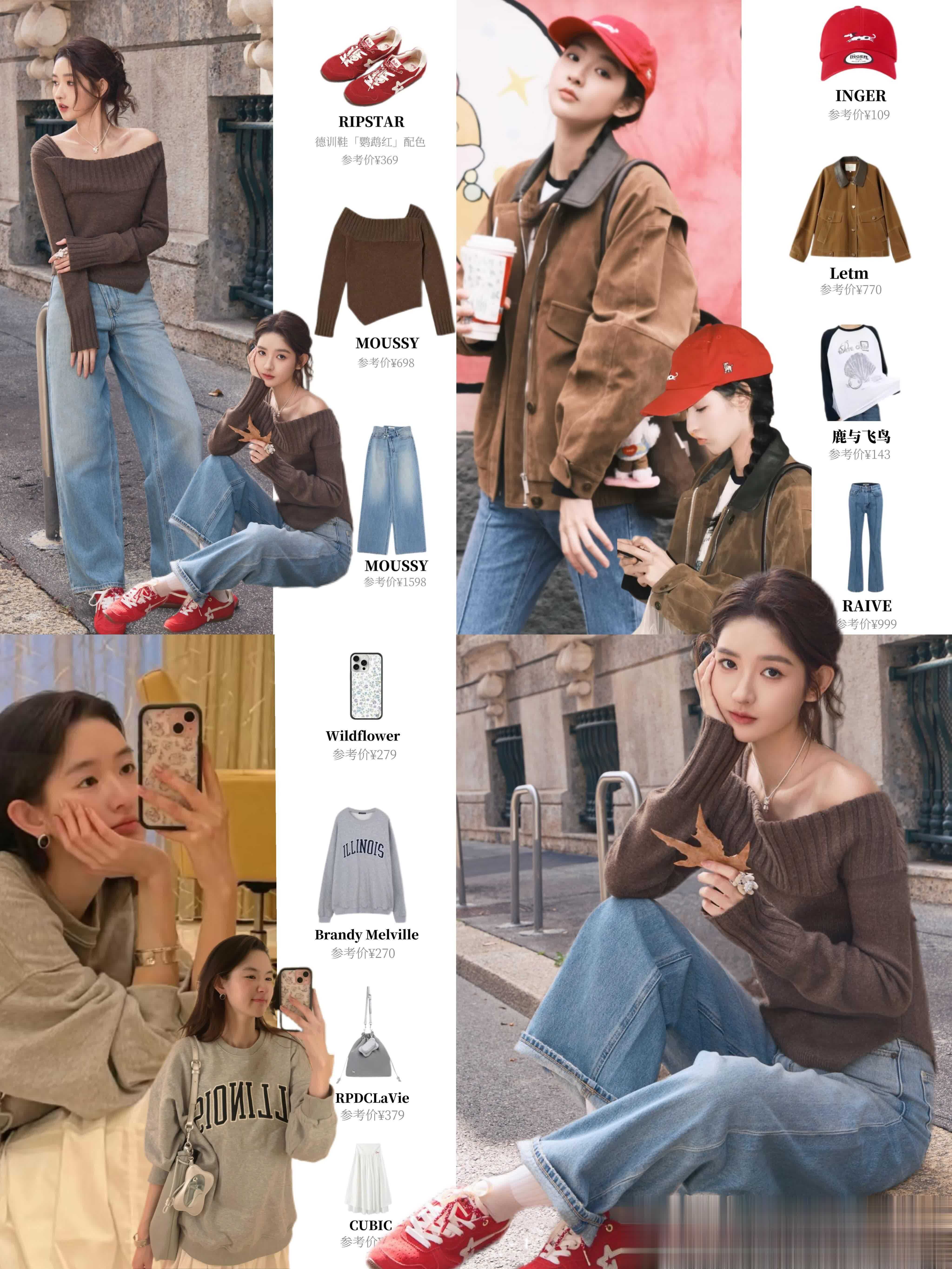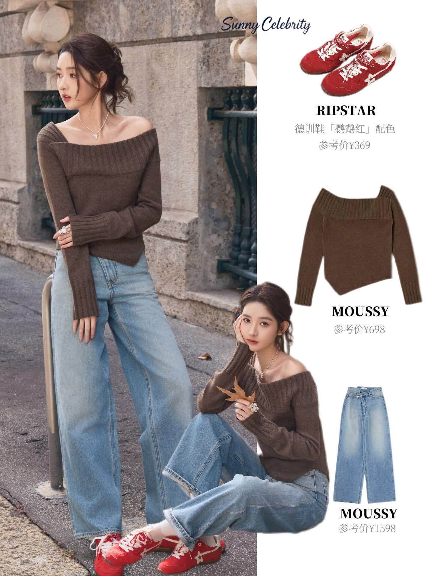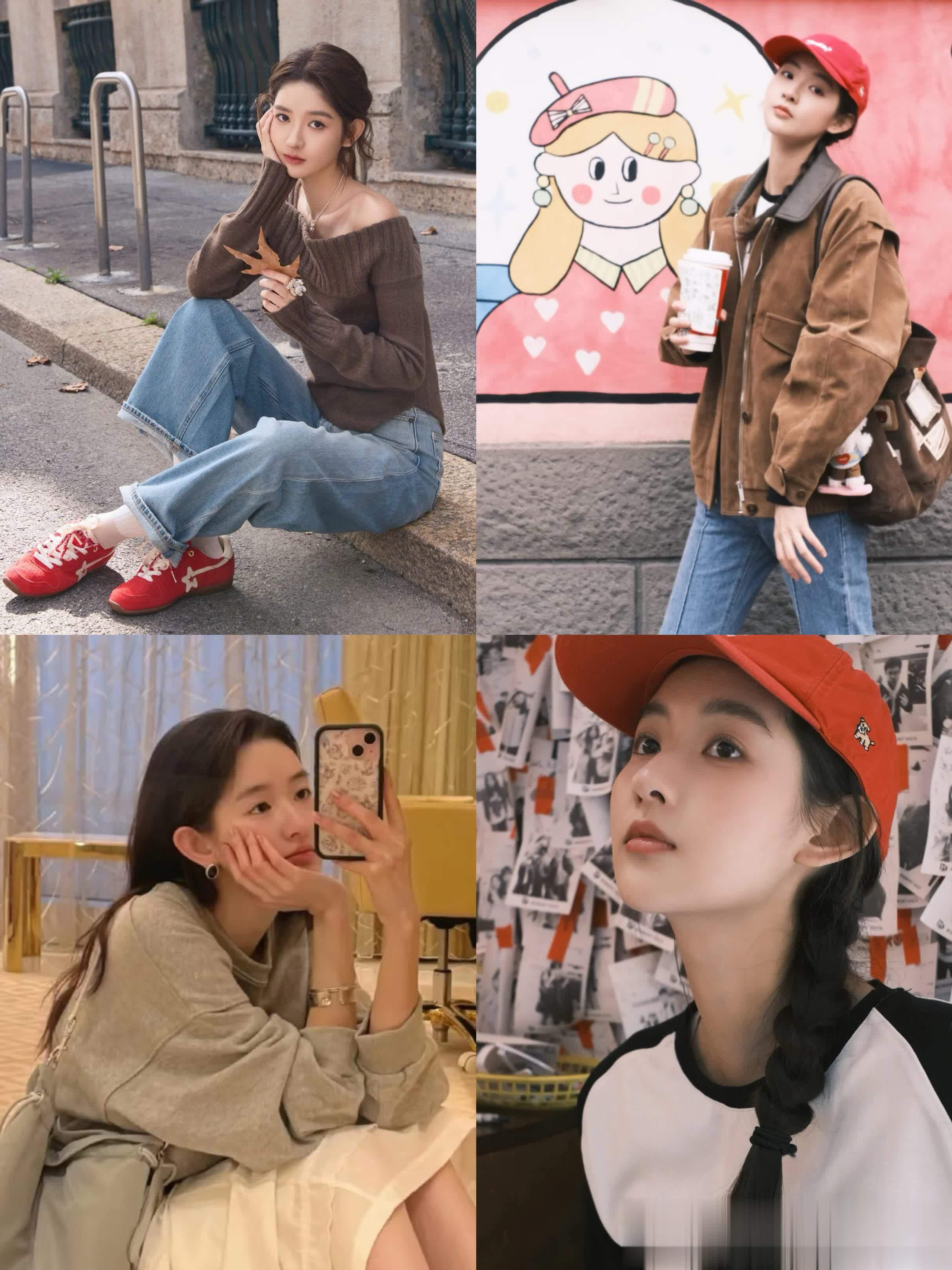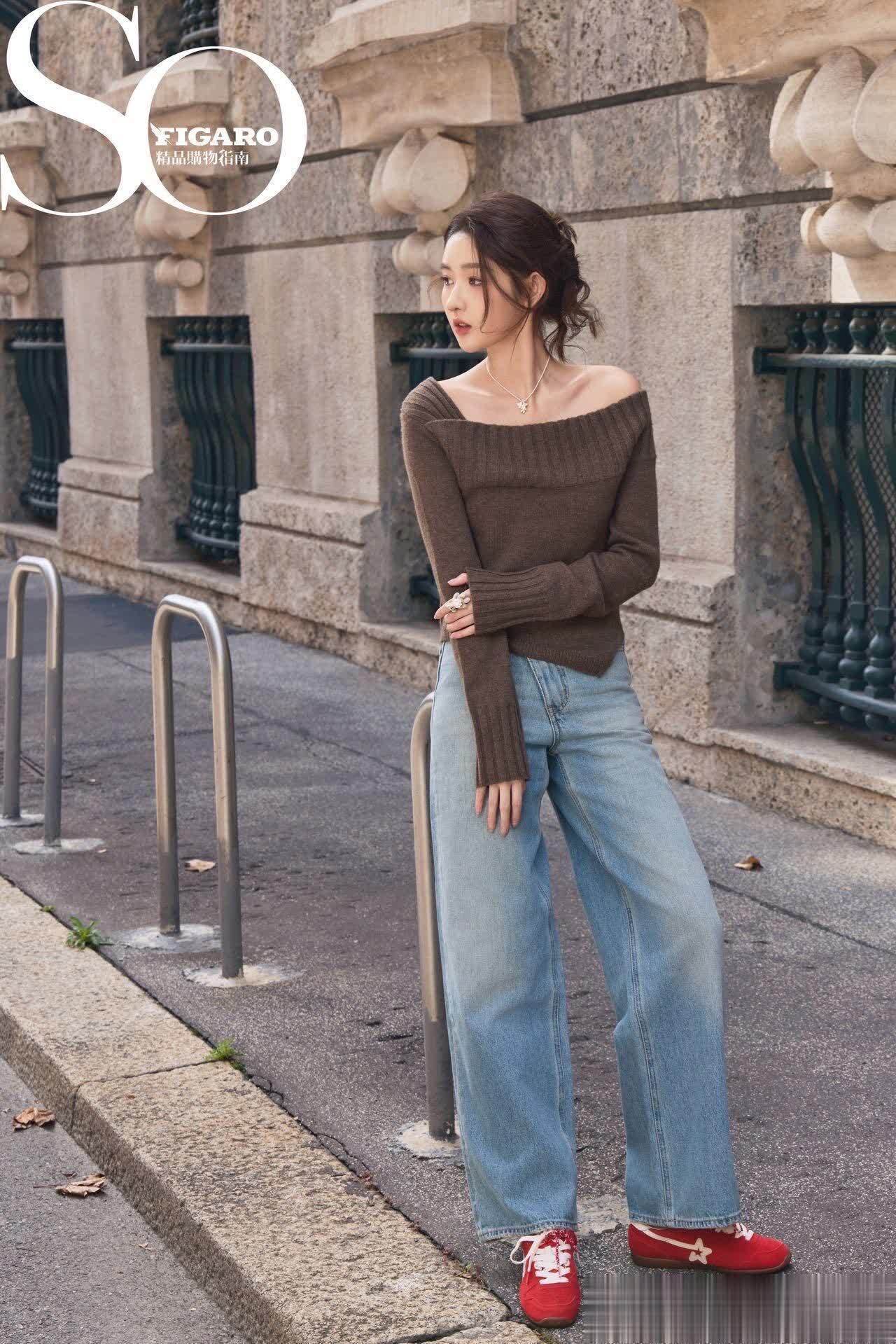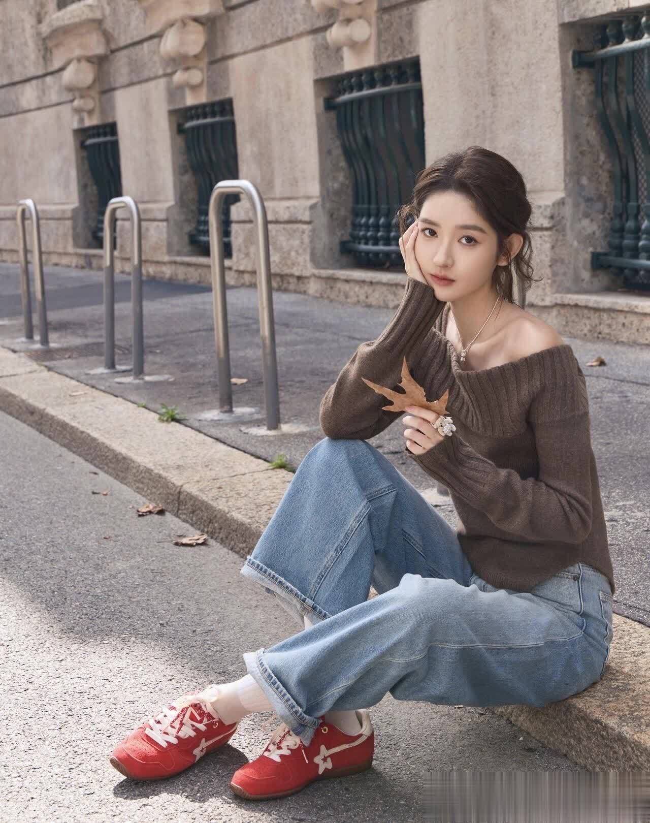 先看她最出圈的“露肩针织衫+阔腿牛仔裤”组合,简直是“早秋氛围天花板”!深棕色露肩针织衫是软糯的坑条纹理,一字肩设计露出精致锁骨,小性感藏得恰到好处,而且特别显头肩比。下半身配的浅蓝阔腿牛仔裤,垂坠感绝了,裤型宽宽大大,走路带风却完全不压个子,158穿都能秒变“腿精”。最绝的是她搭的那双红色德训鞋,亮色系瞬间点亮整套搭配,打破棕色的沉闷感,挎个简约小包,戴条细项链,去逛艺术展或者喝下午茶,被夸“你今天好像王玉雯本人”都不夸张~